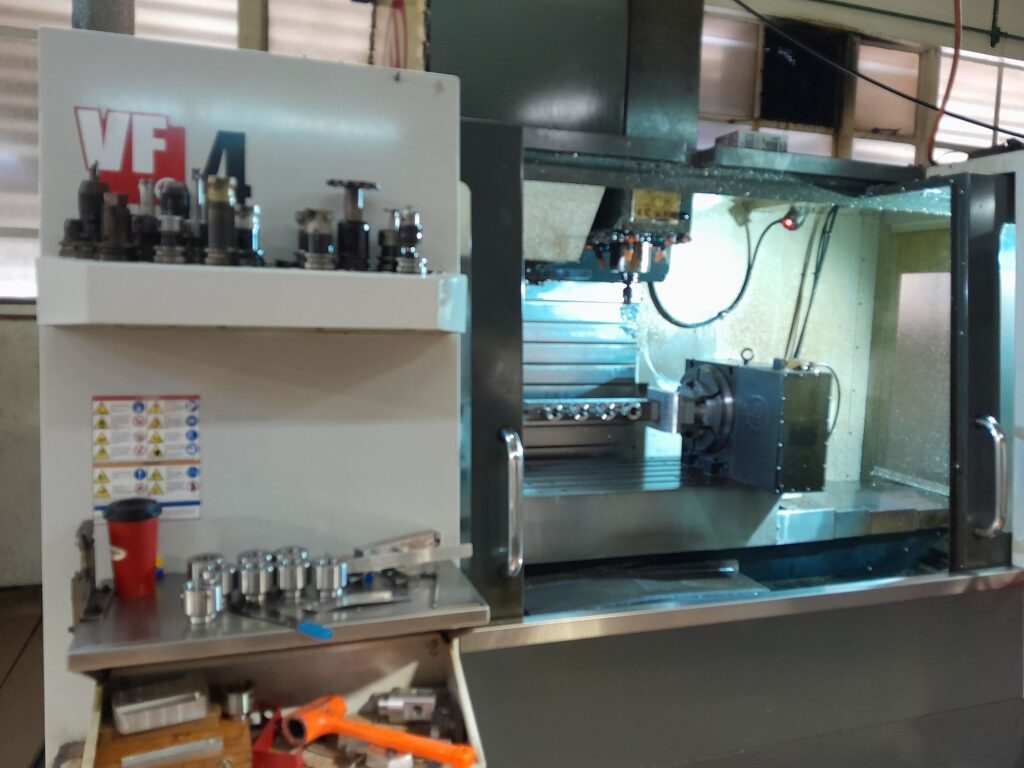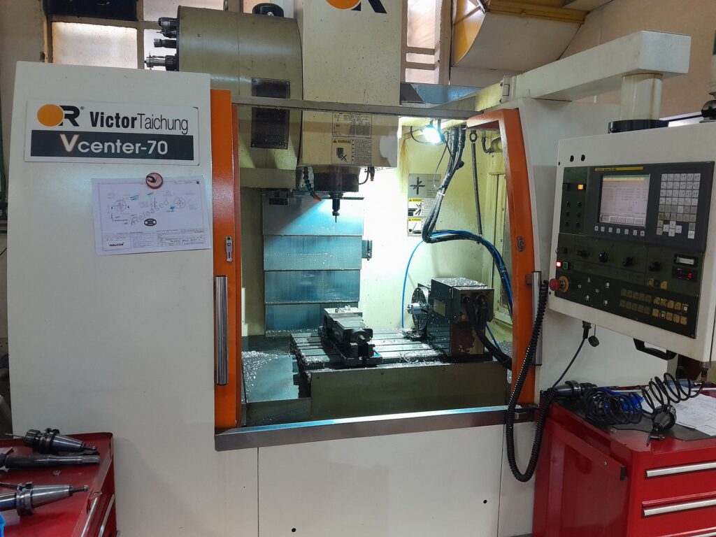 Victor V-center 70 vertical machining centre for sale. X-travel 700mm, Y-travel 480mm, Z-travel 510mm. Has 4th axis. Fanuc Oi-MC. Spindle taper BT 40. 2007 model in very good condition. Kempton Park