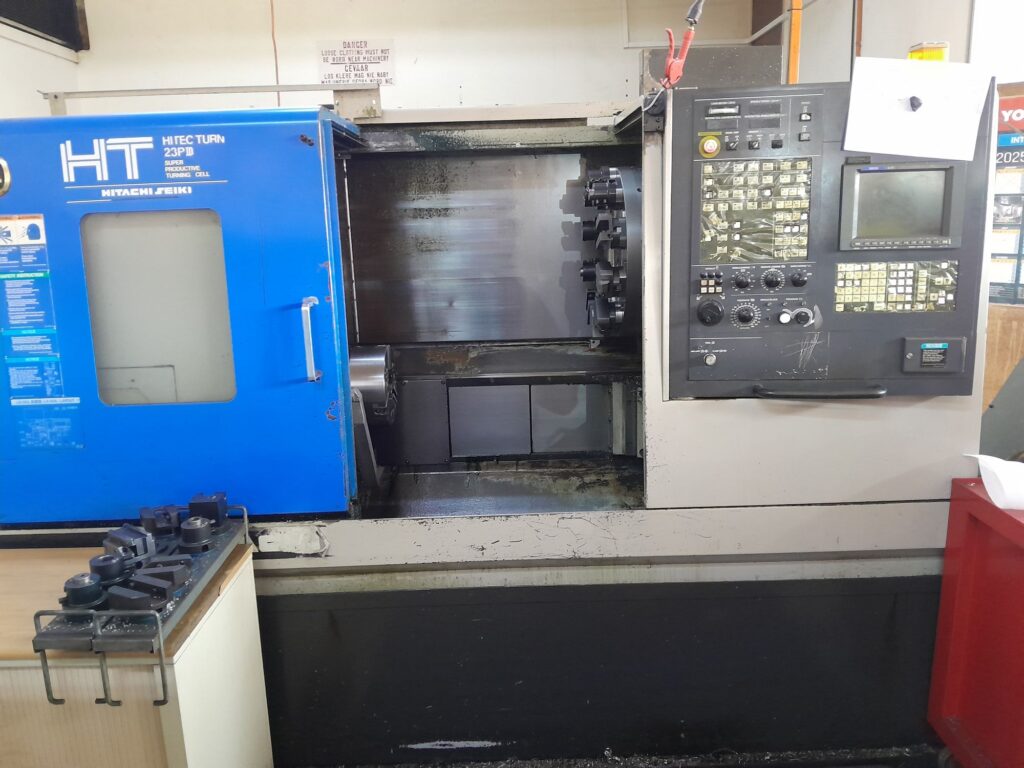 Hitachi-Seiki Hitec Turn 23 PM CNC lathe for sale. Has ten inch chuck. Between centers 600mm. Swing over bed 480mm. Seicos interface with Fanuc drivers in the back. 65mm bore size. 1996 model In full working condition. Kempton Park