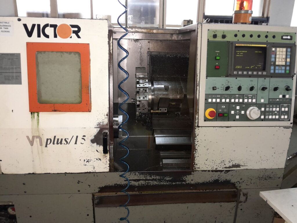 Victor VT Plus 15 CNC lathe for sale. Has 8 inch chuck. 280mm turning diameter, 500mm swing, 420mm turning length, 65mm bar capacity. Fanuc OT operating system. 12 tool stations. Benoni.