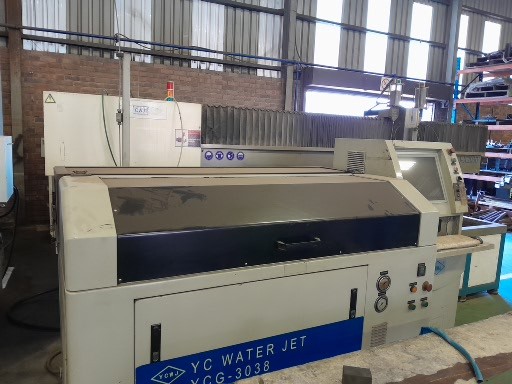 YCG-3038 waterjet cutting machine for sale. Cuts up to 150mm steel as well as a variety of other materials. Cutting accuracy 0,1mm, control accuracy 0,01mm. Three axes. Has a 40hp/30kw pump. Cutting table 3000mm x 2500mm. Boksburg